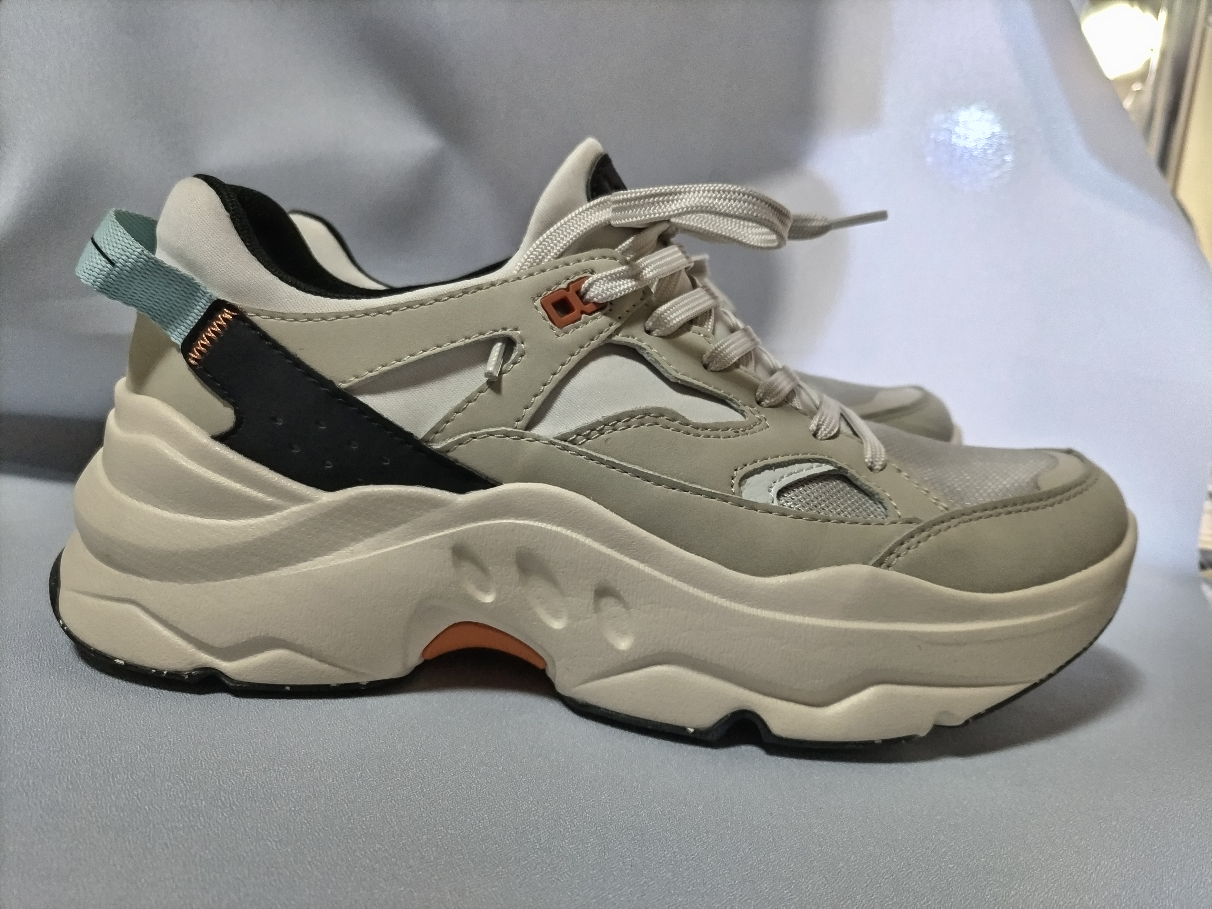 真っ白いスニーカーは汚れがすぐ着くので頻繁に消しゴムでゴシゴシしたり、専用の泡で擦ったり大変でしたが、サンドは白っぽいけど、真っ白ではないので思ったより汚れにくく快適に過ごせています。